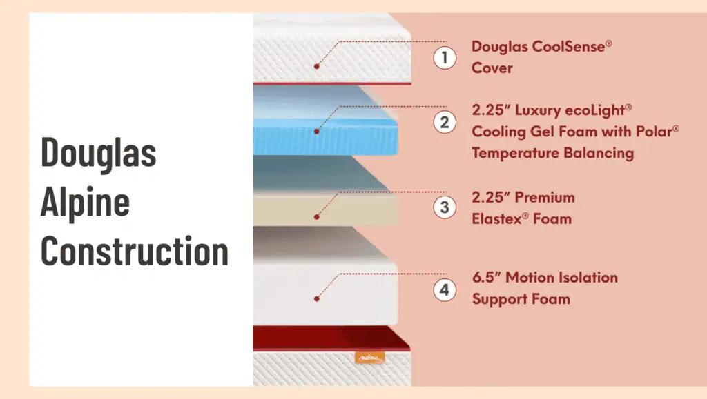 2. EcoLight + Polar Temperature Foam. This 2.25” layer of memory foam is infused with cooling gel and enhanced with Douglas Polar Temperature Balancing Technology. For those who sleep hot, this layer does a great job of reducing temperatures no matter how warm you keep your bedroom.